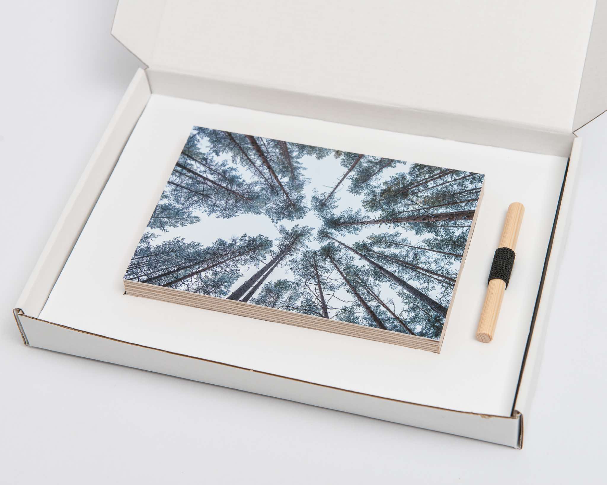 Vaneriblokin kuva tulostetaan mattapintaiselle Fine Art valokuvapaperille, joka liimataan happovapaalla liimakalvolla vanerin pintaan. Kuva voidaan tulostaa sellaisenaan tai vaihtoehtoisesti niin, että vanerin pintakuvio kuultaa läpi kuvan valkoisten sekä vaaleiden sävyjen kohdissa. Vanerin paksuus vakiona 21 mm.